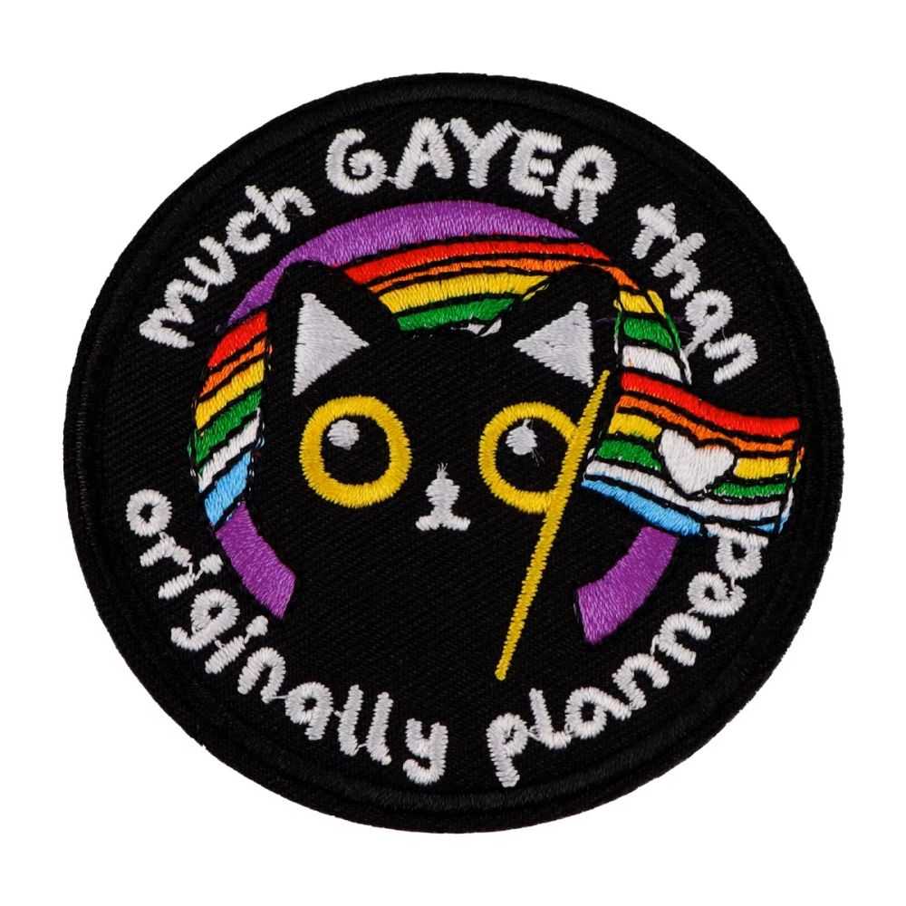 Surprise! Turns out you're way gayer than the original blueprint — and this adorable cat is right there with you. Featuring a wide-eyed kitty holding the Progress Pride flag and surrounded by a rainbow, this round embroidered patch brings queer joy and chaotic cuteness to any jacket, tote, or vest.