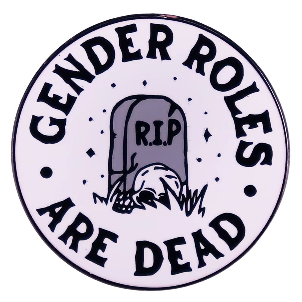Stick a pin in the binary—literally. This bold round enamel pin features a tombstone marked “R.I.P” with the phrase “Gender Roles Are Dead” circling the scene. Perfect for anyone ready to lay outdated norms to rest and live authentically.