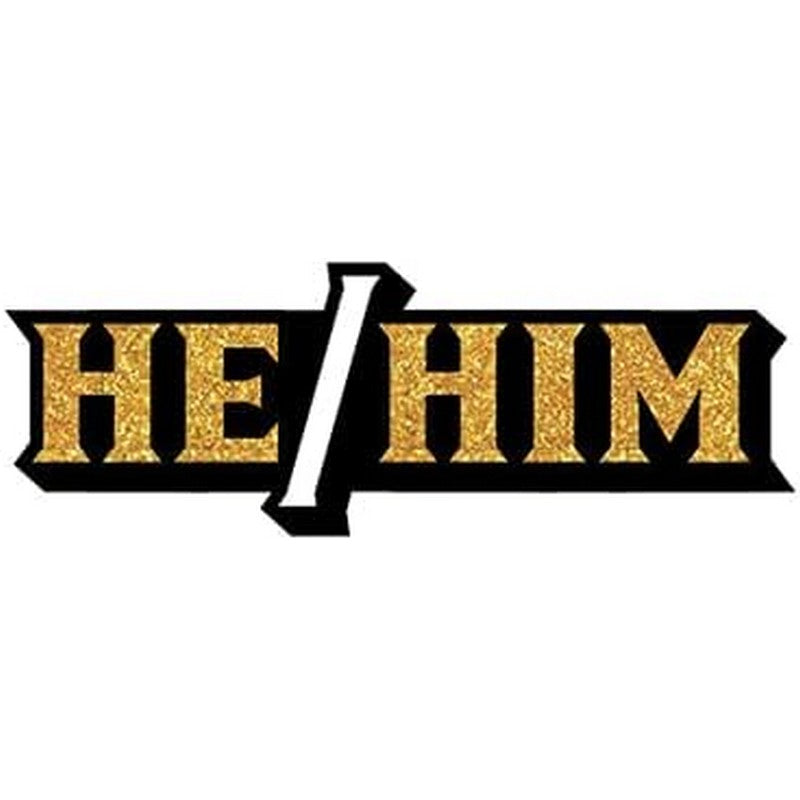 Confident and stylish, this "He/Him" badge brings the glam with gold glitter text on a black background. The crisp white slash in the middle adds definition to this bold expression of identity.