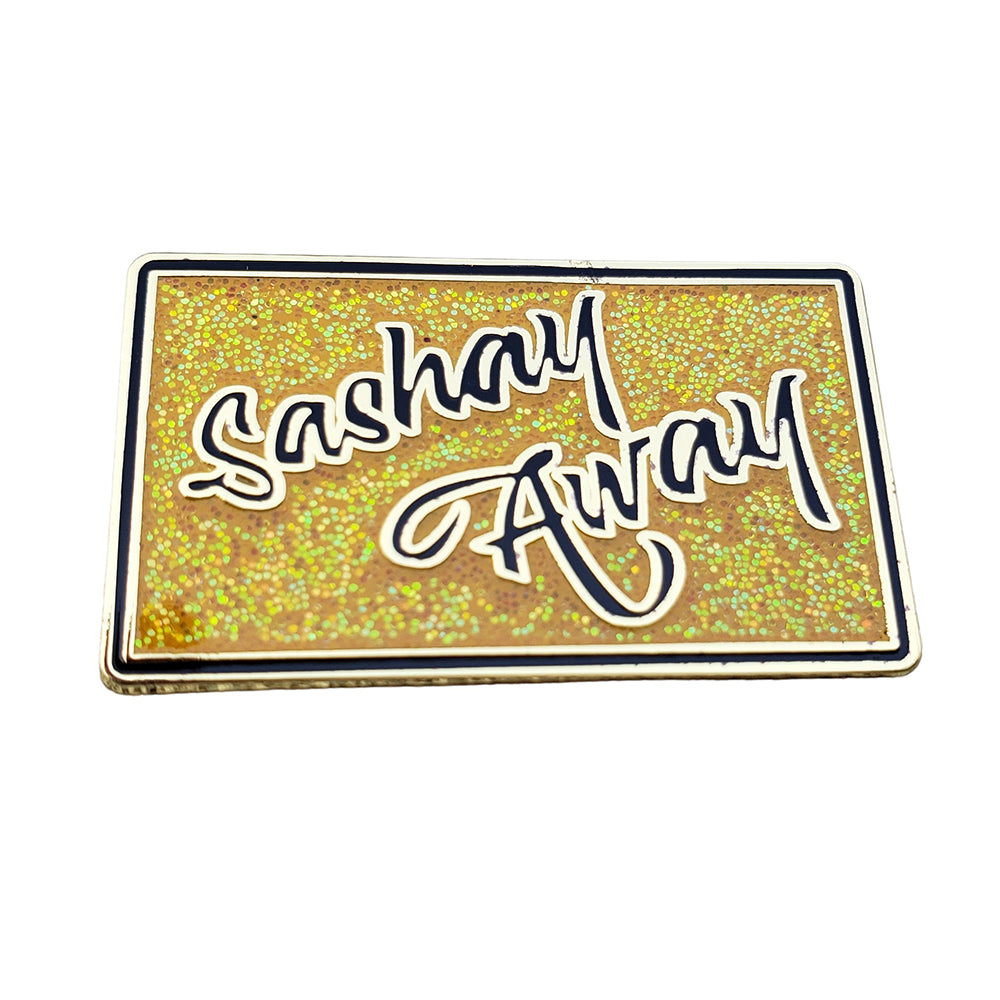 Serve drama and dismissals with sparkle. This glittery gold enamel pin boldly says “Sashay Away” in black script — a fabulous nod to iconic moments from drag shows. Whether you're leaving the party or just making an entrance, this pin makes sure you do it with flair.