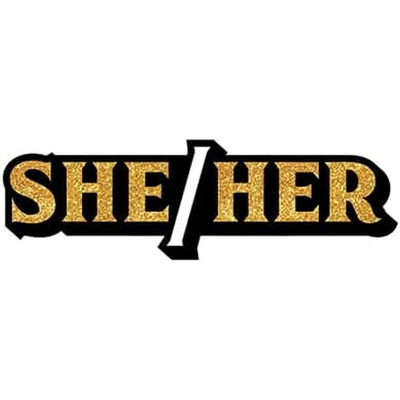 Own your sparkle with this dazzling "She/Her" pronoun badge. Gold glitter lettering pops against a sleek black base with a white accent slash—perfect for expressing yourself loud and proud.