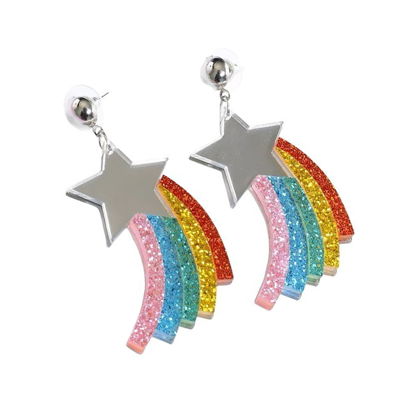 Shine bright like the fabulous star you are with these Glitter Rainbow Star Earrings! Featuring a mirrored silver star and glittery rainbow trails in pastel and bold hues, these earrings are a full-on celebration of sparkle and self-expression. Lightweight yet full of presence, they're perfect for Pride parties, drag nights, or anytime you need to bring the drama.