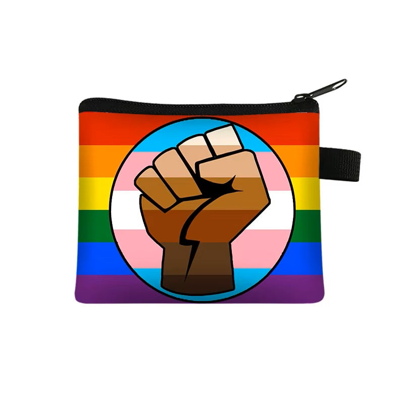 Pride meets protest in this powerful pouch. Featuring a raised brown fist over a backdrop of rainbow, trans, and BIPOC-inclusive stripes, this coin purse embodies solidarity, resistance, and commitment to the whole community. Small in size, mighty in message.