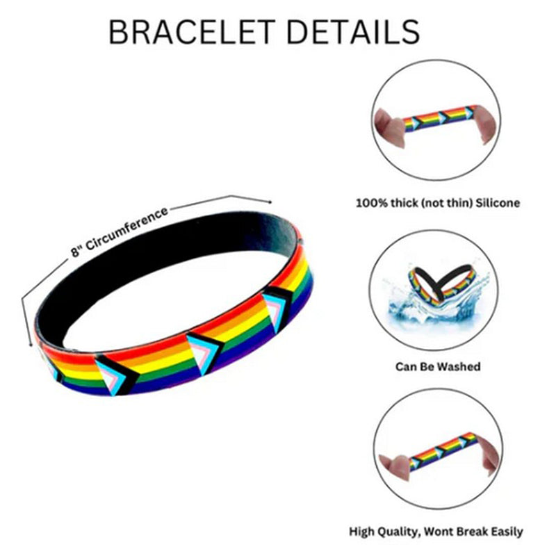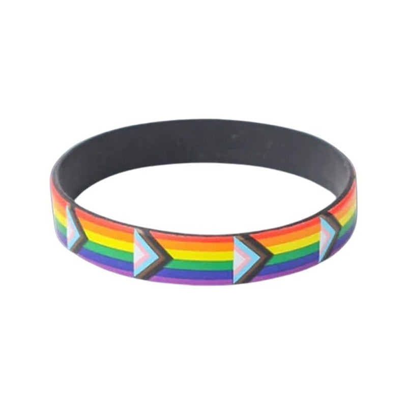 These Daniel Quasar silicone bracelets have the ever popular progress pride flag printed on the wristbands. These silicone bracelets are made of high quality 100% silicone that you can see and feel. These bracelets have the progress pride flag printed in bright, vibrant colors all the way around the bracelet. The bracelet is approximately 8 inches in circumference.
