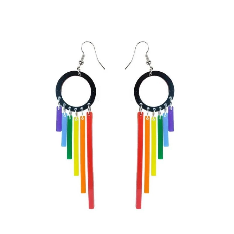 Make a bold statement with these vibrant Rainbow Hoop Cascade Earrings! Featuring a sleek black circle base and cascading rainbow acrylic bars, these earrings radiate movement, colour, and pride. Lightweight and full of flair, they’re perfect for parades, parties, or just brightening up your day.
