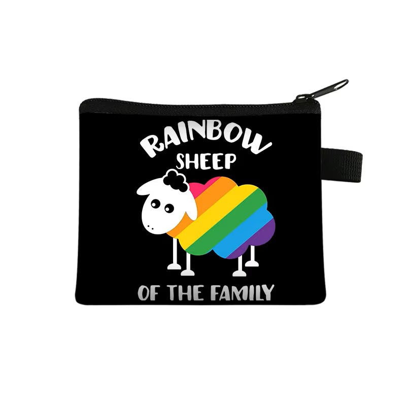 Be the boldest black sheep in the flock. This cheeky coin purse features an adorable rainbow-striped sheep on a sleek black background with the phrase “Rainbow Sheep of the Family.” Perfect for coins, cards, or small essentials — and even better for showing off your fabulous outsider status.