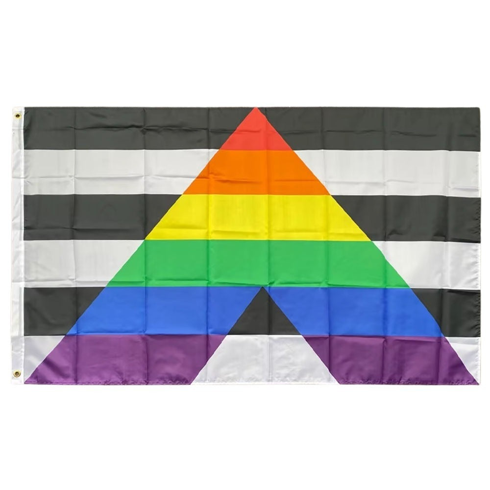 This flag features a bold rainbow "A" — for "Ally" — over a black and white striped background. The rainbow symbolizes support for the 2SLGBTQ+ community, while the stripes represent heterosexual/cisgender identity. It's a clear and colourful way for allies to show their solidarity and support for equal rights and visibility.